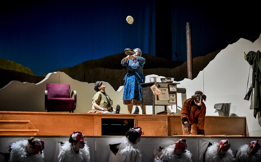 The three-level stage provides much flexibility. In addition, the back wall opens horizontally in the first act, as if a piece of paper was torn in two. This is the moment the young vixen, who is still in captivity, looks out into the dawn landscape from the yard of the forester's house, seeing the free world and noticing her later husband, the fox. The sight is dazzling. In the emerging, lavishly lit, idyllic landscape, we see cardboard trees, bushes, and mountains layered behind each other, which further enhances the sense of the depth of the stage.