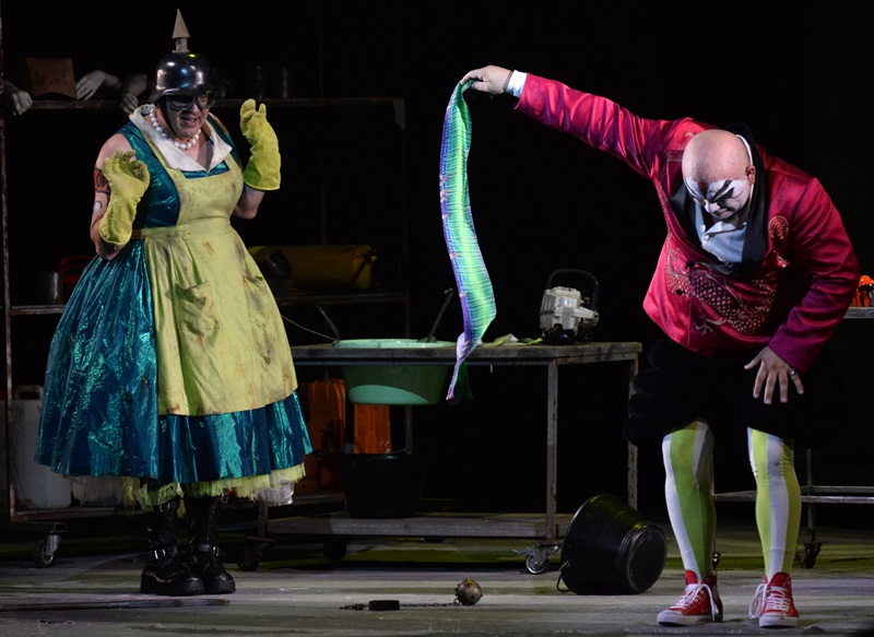 Siniša Štork played the funny character of the ferocious cannibal, the Cook, who kills his victims with a ladle. The bass singer was dressed up as an old woman, wearing a war helmet. (Truffaldino gives him a beautiful ribbon, and beautiful ribbons are the chef’s weakness. He immediately softens, so the Prince and the Jester succeed in stealing the three oranges from him.)